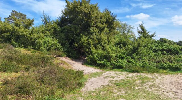 Een flink deel van de Zeegserduinen bestaat uit een zandverstuivingsgebied waaraan het terrein ook zijn naam ontleent. Kees bereidt mij niet voor en ineens staan we voor de enorme jeneverbes. Wel 450 tot 475 jaar oud, zo wordt geschat. Mooist van al: je kunt erin! Die ene struik heeft een soort berceau gevormd. De oudste delen hebben een schors die in de verte doet denken aan die van de sequioa, vezelig en bladderend. Zijtakken die neerwaarts buigen lijken wel gepolijst. Dat komt door het vele aanraken door mensen. Als monument kun je niet alles hebben: zeldzame mossen en paddenstoelen zullen zich hier veel minder vertonen dan bij exemplaren waar geen mensen komen.