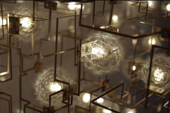 Wat bekender in Nederland (want Publieksprijs Zomerexpo 2011 in Haags Gemeentemuseum gewonnen), zijn Lonneke Gordijn en Ralph Nauta. Hun installatie Fragile Future III is opgebouwd uit talloze kleine raamwerkjes van brons waarin ledlampjes zijn bevestigd. En al die leds hebben een soort stralenkransen gemaakt van… paardenbloempluizen!