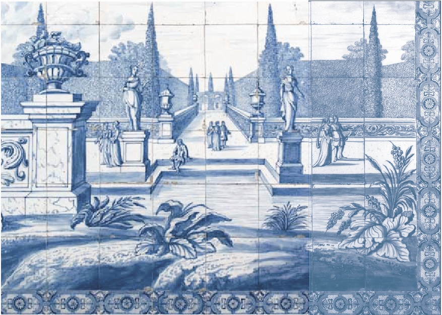 Er zijn verschillende joekels van tegeltableaus naar de beroemde gravures die Daniel Stoopendaal voor het pronkboek De Zegepraalende Vecht maakte. Grappig om te zien dat die strakke lijnvoering van de gravures in iets fluweligs of ronduit wolligs verandert op de gebakken klei. Ze krijgen welhaast de charme van volkskunst.