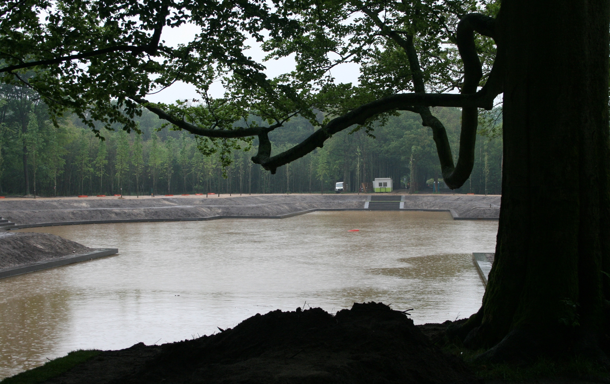 Jarenlang was die eigenlijk niet meer dan een modderpoel met een afgetrapt grasveld eromheen. Nu ligt hij er strak belijnd bij. Mooi, dat spel van rechte en gebogen randen, van de hoekigheid van de trappen en het glooiende van de beschoeiing.