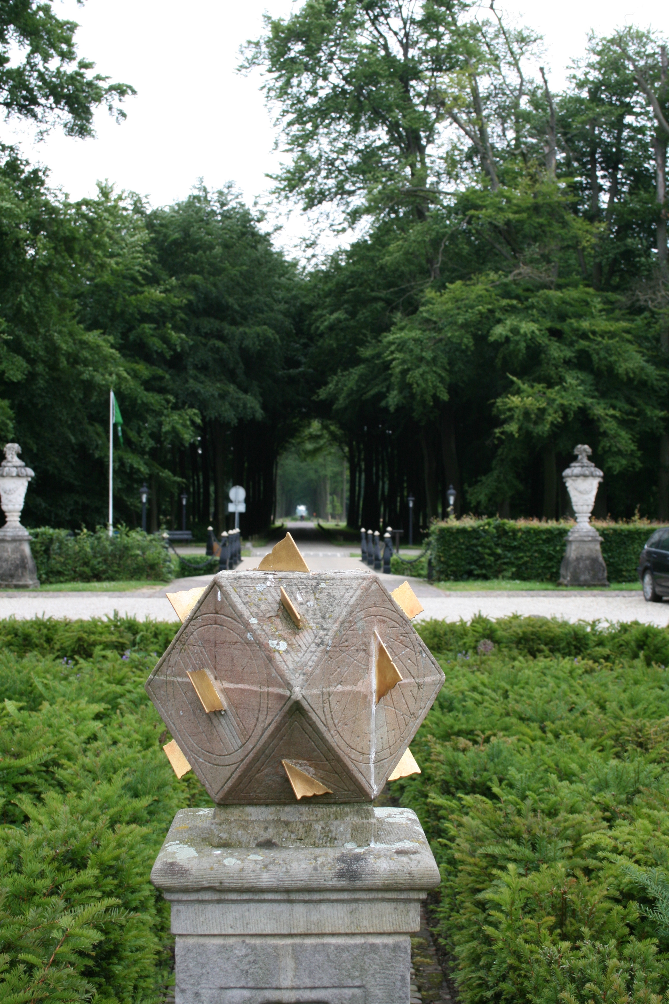 Eerst maar het antwoord op de vraag van gisteren, ‘wat is die vreemde veelhoekige steen?’. Het is een zonnewijzer. Alleen de metalen plaatjes, de schaduwgevers, ontbreken op het Bingerden exemplaar, waardoor hij nauwelijks als zodanig herkenbaar is. Als ik niet de dag ervoor een vergelijkbaar exemplaar, ook uit de achttiende eeuw maar gerestaureerd, op Slangenburg had gezien, had ik het ook niet geweten. Al het rekenwerk dat er in gaat zitten om de tijdsaanduiding op de afzonderlijke vlakken kloppend te krijgen, geeft al aan dat dit ook bravourestukken zijn.