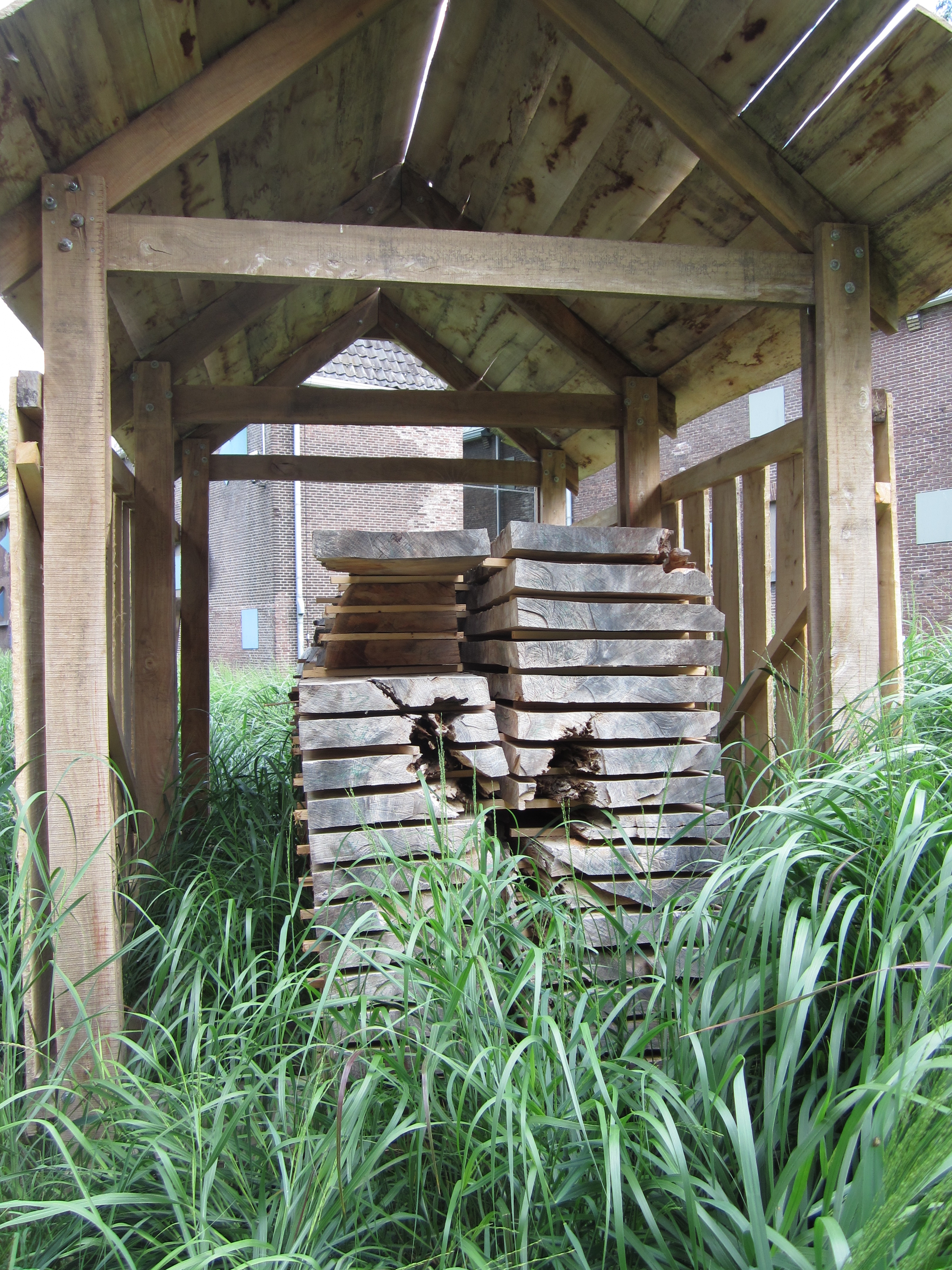Een van die drooghuizen staat op de binnenplaats van het Centraal Museum. De planken zijn zo gestapeld dat je goed kunt zien dat de kern van de boom rot was. Mooi, hoe zo’n holle hartvorm ontstaat. Zoals de grote Engelse landschapsarchitect Humphry Repton in 1803 al zei: “The man of science and of taste will…discover the beauties in a tree which the others would condemn for its decay.”