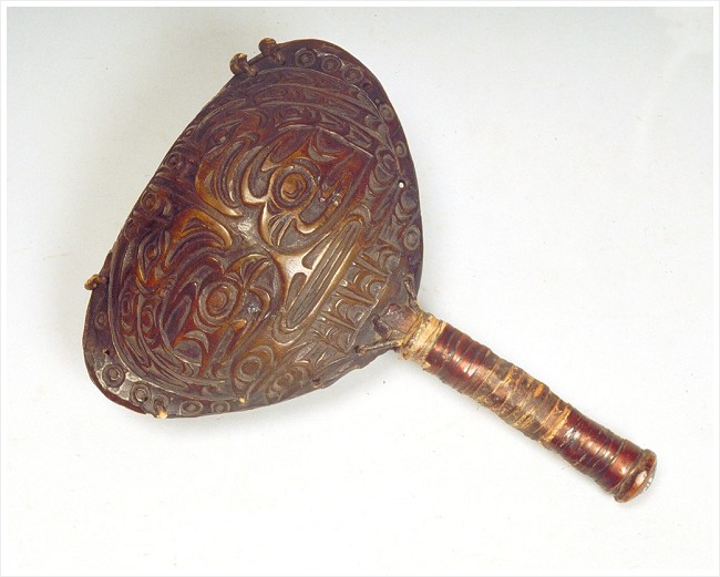 De rammelaar is verzameld in 1778 tijdens een ontdekkingsreis van James Cook. Hij hield zich ondermeer bezig met door de Britse kolonisator zeer gewaarde cartografische opnemingen. In de Indianenhuizen vond hij vooral “filth and confusion” en in hun houtsnijwerk zag hij “a truly monstrous figure”. In het kielzog van Cooks exploraties volgde meestal verdere kolonisatie die hele culturen om zeep hielp en de oorspronkelijke landschappen ruïneerde. De gevolgen daarvan werken tot op de dag van vandaag door. Leiden gaat dat treurige feit niet uit de weg. Er is een filmpje te zien waarin clanhoofd Sidney Crosby zegt: “Come and see what we are trying to fight for, to save, so that the people from around the world can still come to a place and eat of the ocean and walk trough the big timbers, which few we still have.”
