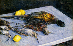 Eerder al had hij veel geschetst langs de rivier de Yerres. Zijn regentafereel is geweldig met die kringen en spiegelingen in het water. Maar in zijn tijd zou het doek ronduit raar gevonden zijn met die schuine lijn door het beeld. Of neem zijn stillevens. De dode fazant en houtsnippen, die citroenen als zonnen, allemaal geweldig geschilderd. Maar ligt dat marmeren blad niet onder een te schuine hoek? En waarom zijn die snippen links zo vreemd afgeneden?
