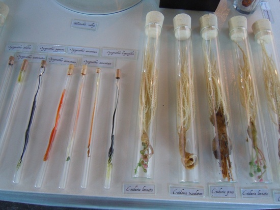 Veruit het mooiste werk in Garage is de installatie van Jeroen Kusters die in eerste instantie zo uit een Kunst und Wunderkammer of een rariteitenkabinet lijkt te komen. Je ziet allerlei geprepareerde planten en dieren die in stopflessen en glazen buizen bewaard worden. Bij elk specimen is een etiket geplakt waarop in schoonschrift staat wat het is, geheel volgens de regels van de taxonomie van Linnaeus – dus eerst de geslachtsnaam en dan de soortnaam, in het Latijn.