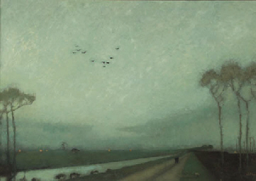 ‘Avondschemering’ uit 1914; een zwerm kraaien in de lucht, her en der een licht van een boerderij, je ruikt het vochtige land, misschien met wat mest. Mankes vangt dat moment van vlak voordat je thuis bent.