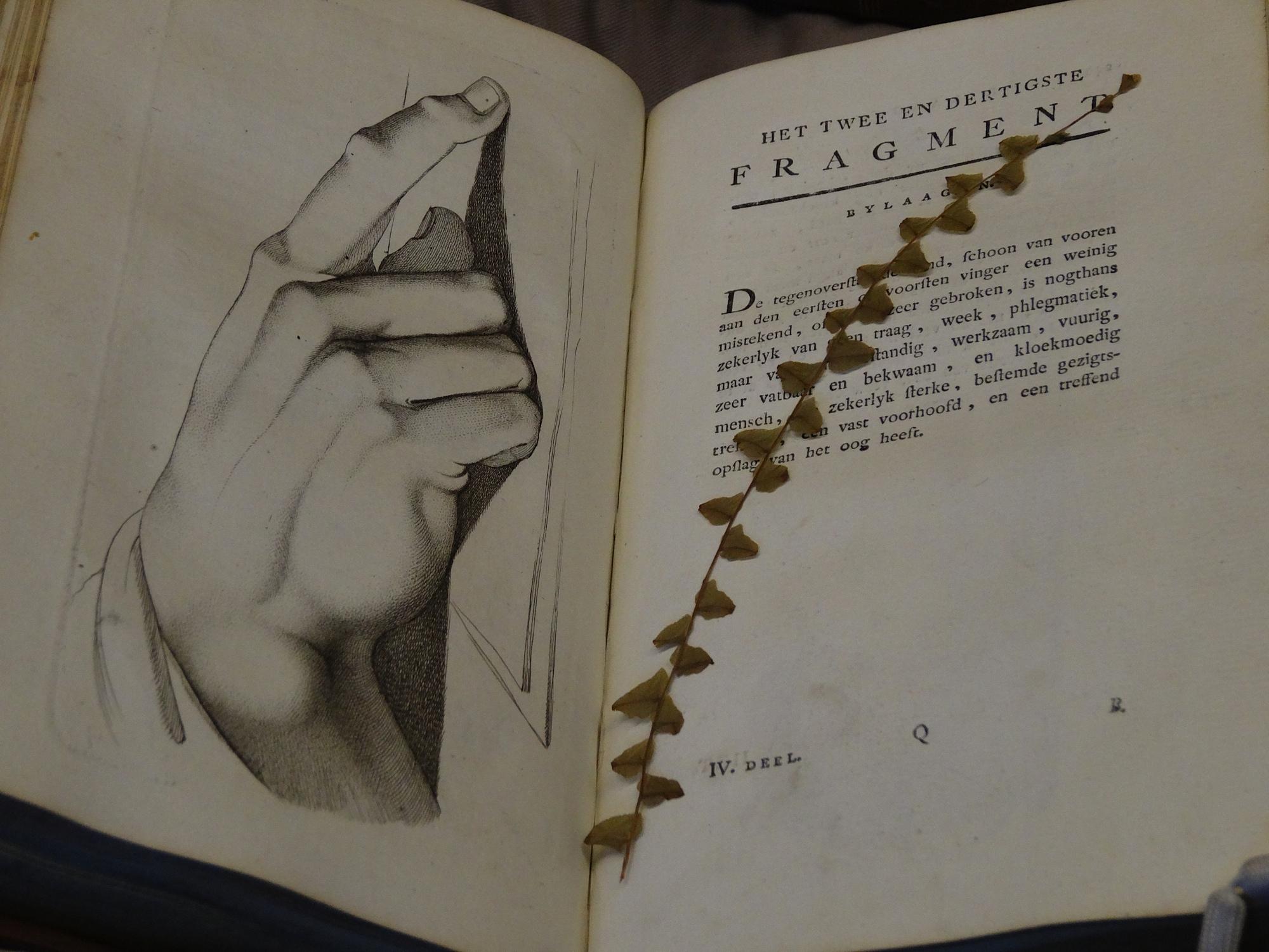 En dan, heel relativerend, als je genoeg hebt van alle chauvinistische nonsens (“een neus van deeze breedte zou allen als het gewrocht van een moeilyk te beschaaven karakter moeten toestraalen”) zie je dat iemand deze zware boeken gewoon als plantenpers gebruikt heeft.