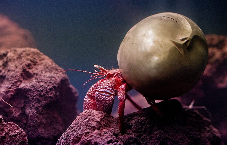 Misschien een beetje een truc, maar wel een die werkt, huist in een groot aquarium dat Pierre Huyghe neerzette: een heremietkreeft die zijn intrek heeft genomen in een goudkleurig masker. Natuurlijk, bij gebrek aan een lege schelp zal zo’n beest the next best thing aangrijpen om zijn woningnood te ledigen, dat alleen is te voorspelbaar om kunst te zijn. Maar er gebeurt heel veel met de kijker bij deze waterbak: een spel van aantrekking en afstoting. Is de kreeft het gedrocht of dat akelige masker? Zijn ze eigenlijk niet ook allebei heel mooi? Is het de combinatie die het zo ongemakkelijk maakt? Het is dusdanig fascinerend dat je een paar keer terugloopt om te kijken…