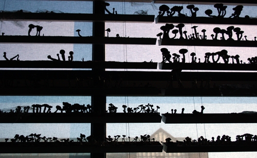 Er zijn ook kunstwerken die zeker rijk gelaagd zijn in betekenissen maar die ook heel direct een esthetische aantrekkingskracht hebben. Neem de paddenstoelen van Zeger Reyers. Die kweekte hij op lamellen voor een kolossale raampartij op. Al die silhouetjes, prachtig! Maar het zijn wel geestverruimende paddo’s…en die zijn illegaal. Althans ze zijn het in gedroogde vorm. Als nu de klimaatbeheersing van het museum zijn werk doet, verandert Reyers’ installatie in een verboden kunstwerk. Reyers zou zo bij de mycologische vereniging aan de slag kunnen, zo veel weet hij van paddenstoelen. Enthousiast vertelde hij hoe hij afgelopen vrijdag op de opening Prinses Máxima een broche van gedroogde roze oesterzwammen aanbood. Maar goed, wat Reyers ook wil vertellen is dat geestverruiming nodig is, ook zonder paddo’s, al was het maar om al die kunst waar het raam op uitkijkt, te vatten.