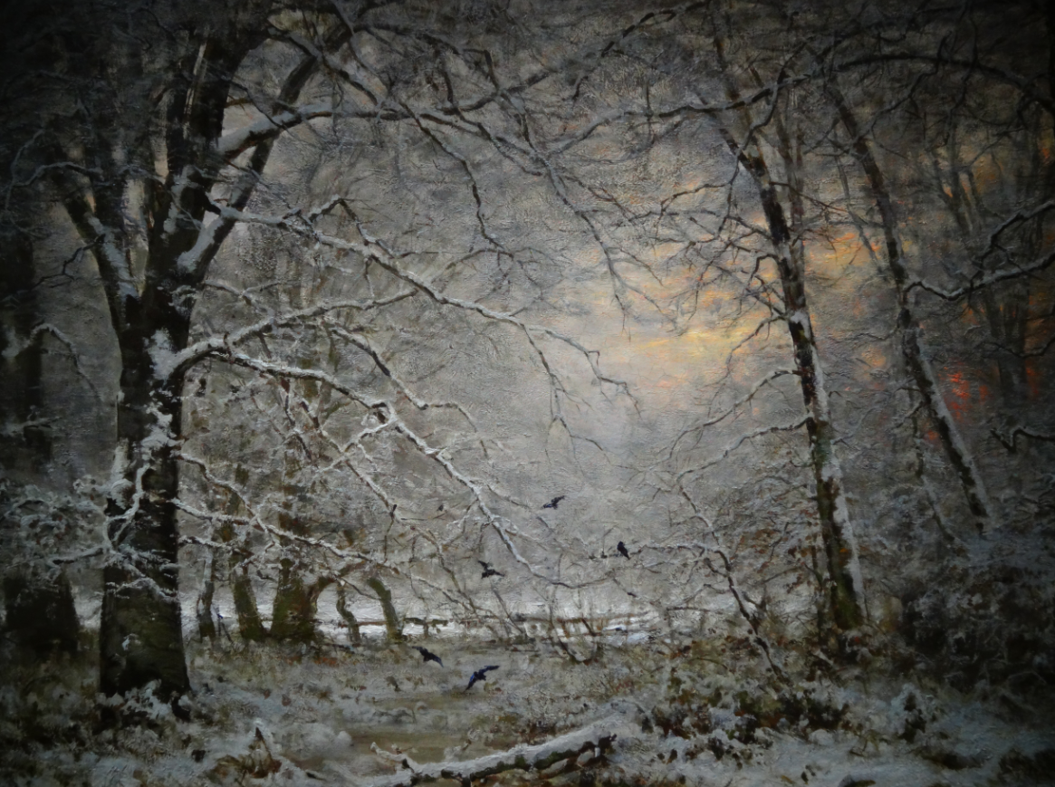 Het mooiste Nederlandse winterlandschap is ‘Bos bij Winter’ van Louis Apol uit 1875. Natuurlijk is het fijn om op een Avercamp, uit de zeventiende eeuw, al die figuurtjes te bekijken op het ijs en in de sneeuw maar Apol geeft je vooral natuur. Soms met een wandelaar of bosarbeider maar vaak ook alleen bos. Hoe Apol hier die roze zweem treft, die je slechts hebt bij een bepaalde kou, maakt het zó winter.
