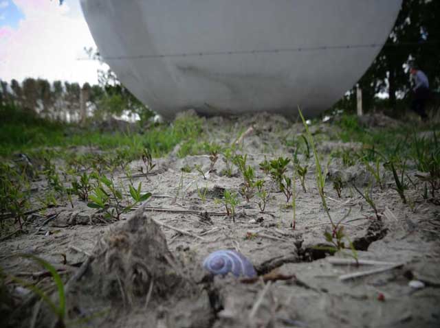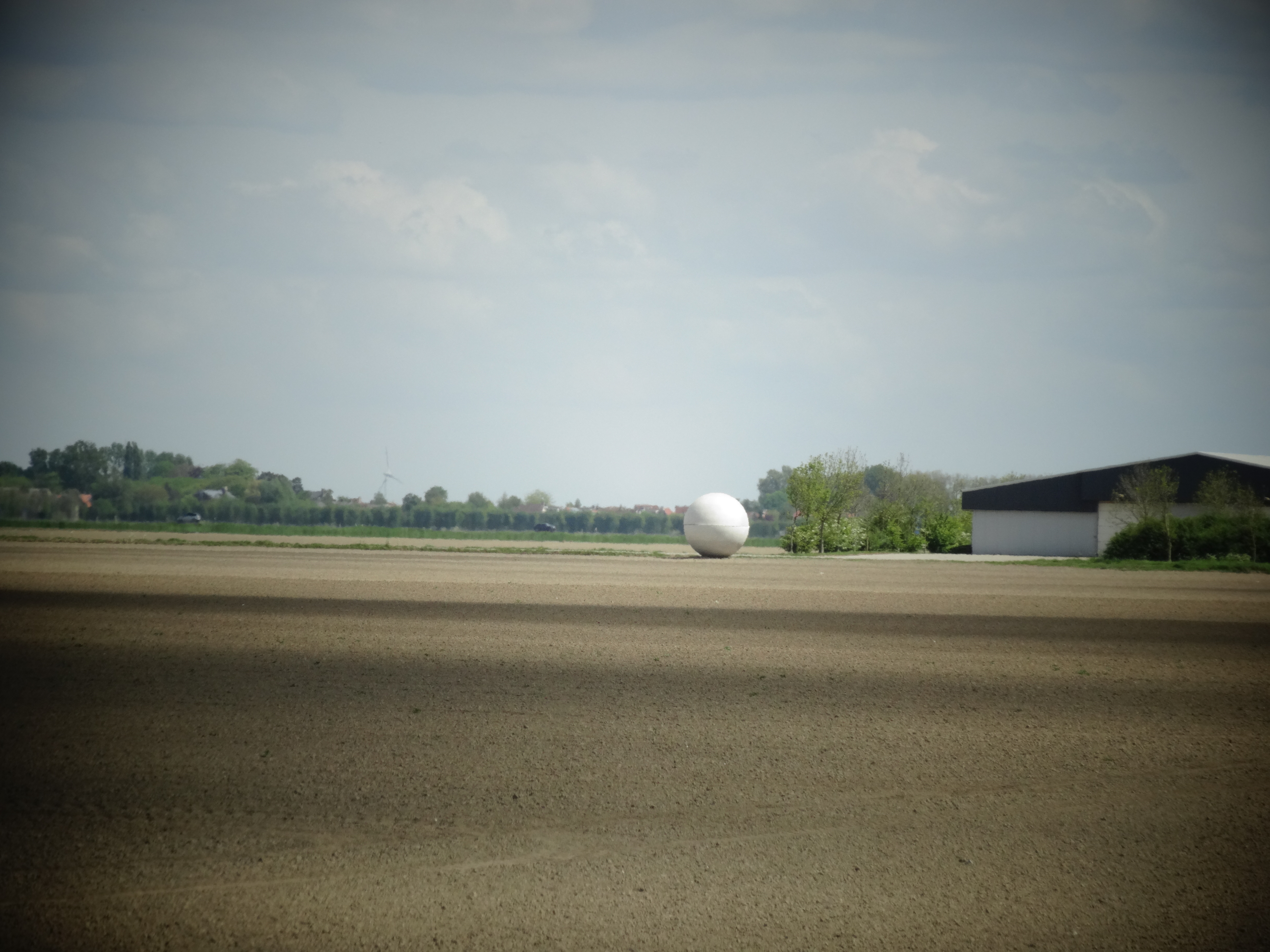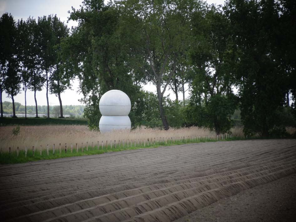 Het landschap van de polder is weids en hoekig: strakke percelen, dijken die een scherpe hoek met het maaiveld maken, lanen met de bomen in het gelid. Het land dat geploegd is voor de aardappels ligt er met zijn patroon van voren bij als een kunstwerk op zich. Hooguit bij een rafelrandje van Natuurmonumenten is het wat minder geordend. De Duitse kunstenaar Michael Beutler (1976) ontwierp voor dit landschap negen betonnen sculpturen met juist ronde vormen. Maar rond is hier niet zuiver bol, de werken zijn afgeplat of ‘scheef’. Alsof er iets niet lekker uit een geboortekanaal is gekomen. Wat is er aan de hand?