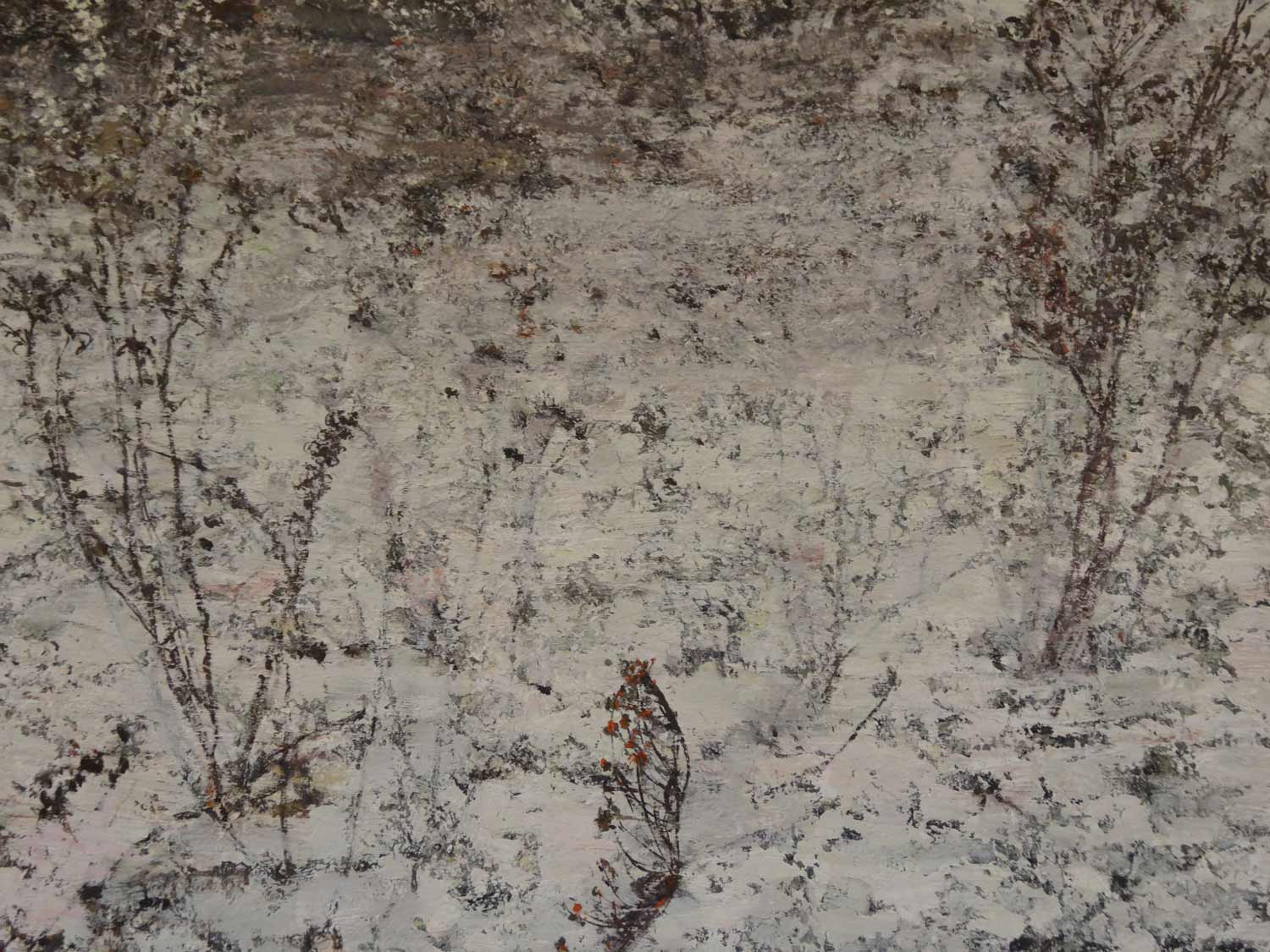 Mankes is onvergetelijk. Nu maakt Han Klinkhamer (1950)indruk met zijn Brabantse uiterwaarden. Vooral twee monumentale winterlandschappen komen binnen. Of is het andersom? Ben ik erin? Dat klinkt wat zweverig maar de kunstenaar doet iets heel bijzonders. Zijn landschappen zijn schilderkunstige illusies, zoals het hoort, zal ik maar zeggen. Je stapt erin. En tegelijkertijd is er ook de concrete werkelijkheid van de verf. Veel verf, gul en rul en een onderzoek op zich waard.