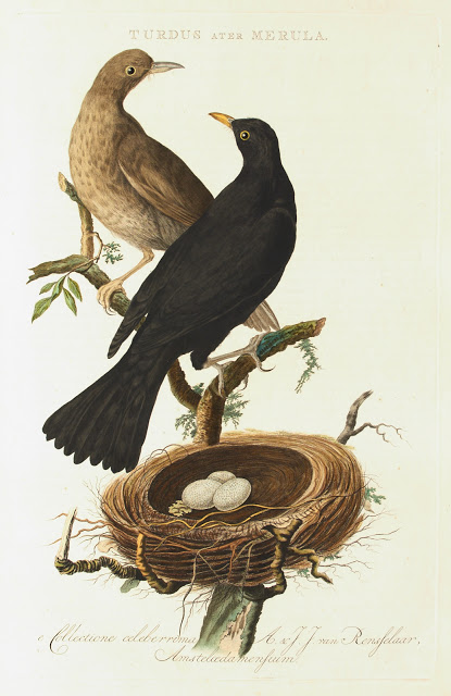 Of ik tweehonderd woorden wil wijden aan Nederlandsche Vogelen? Het is voor Naarbuiten, het blad van Staatsbosbeheer. Ja hoor, ik word ervoor betaald. Nederlandsche Vogelen is een van de kostbaarste producten van onze boekdrukkunst en verscheen in vijf delen tussen 1770 en 1829. Net als bij het veel beroemdere The Birds of America (1827-1838) van John James Audubon, zijn de meeste vogels levensgroot afgebeeld. Dan wordt het vanzelf duur. (In 2010 werd een Birds of America in Londen geveild voor 11,5 miljoen dollar). Het Nederlandse boek wordt ook wel (de) Nozeman en Sepp genoemd, naar Cornelis Nozeman die de eerste teksten leverde en drie generaties Sepp (te beginnen bij Christiaan) die de gravures maakten. Onze meest ordinaire tuinvogel de merel was toen een veel minder algemene verschijning. Nozeman: “De Merel mag een inbooreling genoemd worden, want hy wordt jaerlyks gebroed in sommigen onzer bosschen, dikwils in onze griendten, en meest aen de slootkanten op de koppen van geknotte Willigenstooven.”