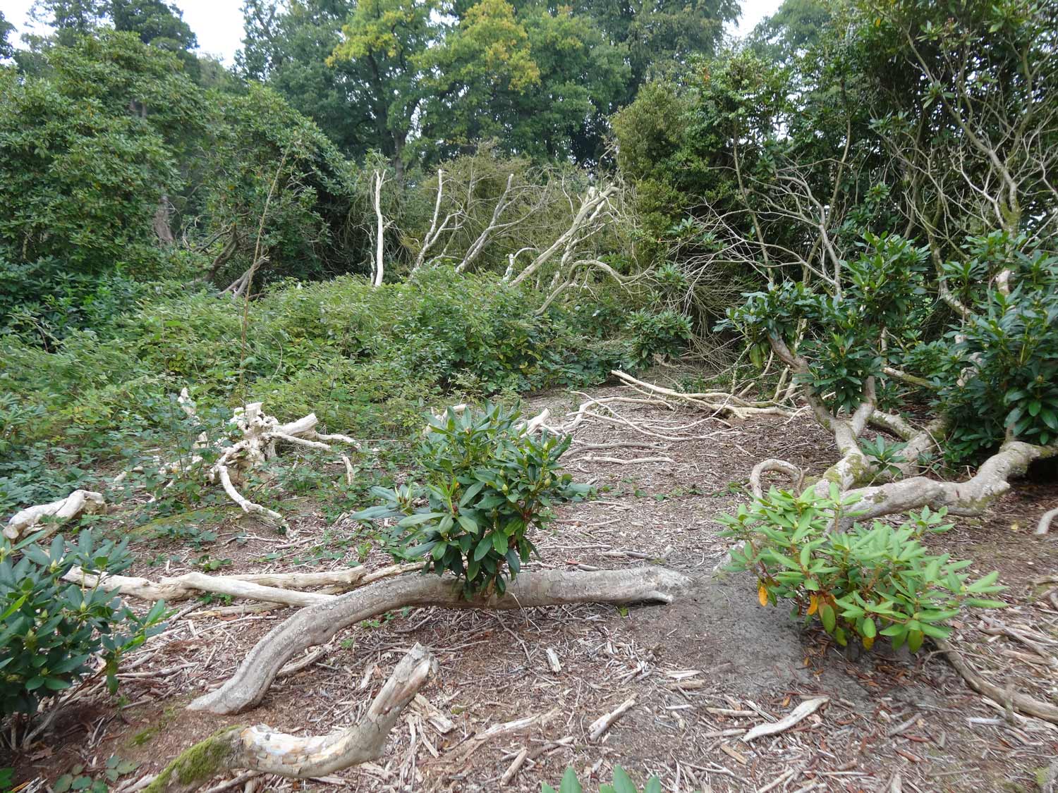 De grote hoeveelheid paddestoelen maakt het al wat herfstig. En onder de beukenboom regent het nootjes. De rododendronpartij, die vermoed ik bij het negentiende-eeuwse ontwerp hoort, is tot een kolossale chaos uiteengevallen. Maar zie de kracht van deze exoot! Uit oude stronken groeit zo een nieuwe struik.