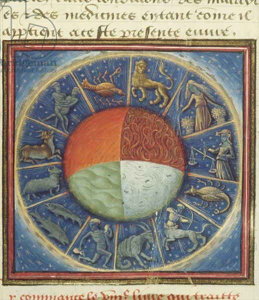 De vier elementen, hun vier eigenschappen en de vier lichaamssappen worden bij de Grieks-Romeinse geneeskundige Claudius Galenus (138 – ca. 203) aan elkaar gesmeed in één systeem. In de middeleeuwen wordt dat nog uitgebreid met een planetenleer. Niet alleen beïnvloedt de stand van de planeten de gang van zaken op aarde, specifieke planeten zijn ook verbonden met bepaalde elementen en lichaamsdelen. Bij verschillende middeleeuwse ‘encyclopedisten’, die alle bestaande kennis te boek wilden stellen, zien we dat prachtig verbeeld, zoals hier bij Bartholomeus Anglicus (1203-1272).