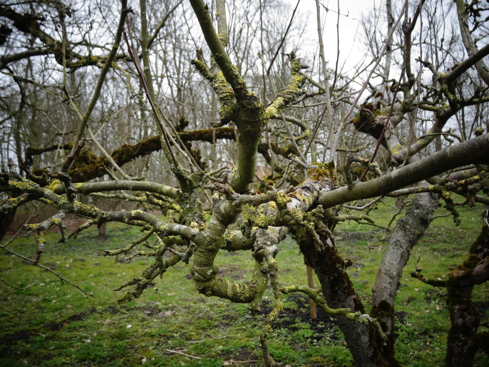 Wat er gebeurt als je een boomgaard laat gaan, zag ik in Abelstok, op het Hogeland. Daar ligt een flink perceel met onder meer Bramley’s Seedling, in het Nederlands ook wel Brammie Zedeling of Sedeling genoemd. De eerste boom van dit appelras is uit een pitje opgekweekt (vandaar de naam), en later veelvuldig verspreid door enten. Je zou op deze plek kunnen spreken van ‘begeleid verval’ of ‘ruïnebeheer’, zoals je dat ook wel bij gebouwen doet. Het resultaat is een sprookje, en ik kan me zo het kasteel van Doornroosje voorstellen, ergens achter de boomgaard. Maar dit wil je niet overal. Sterker nog, één zo’n plek is genoeg. Geen zorgen! Op de Allersmaborg blijven we gewoon beheren.