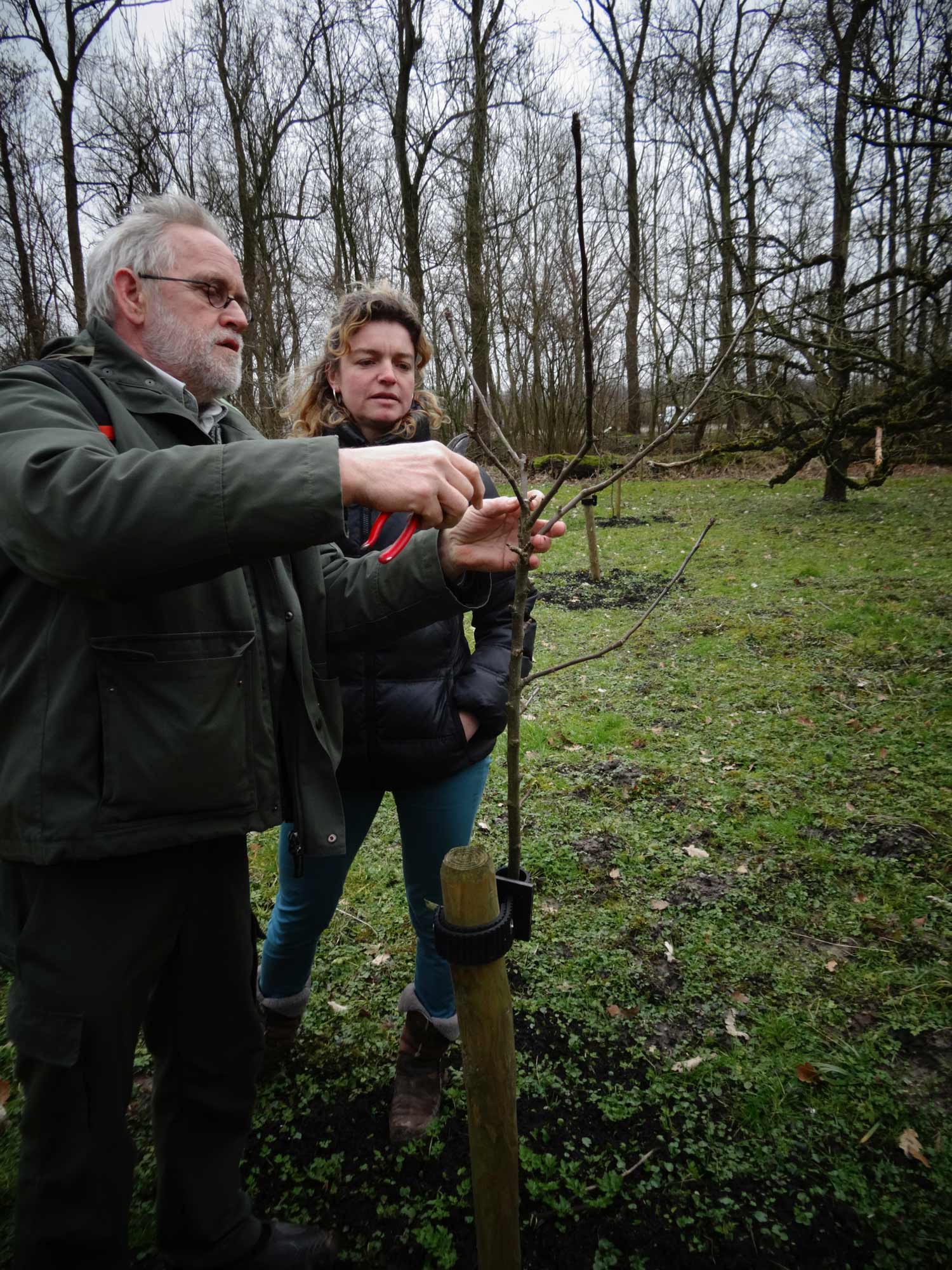 fluitekruid, smeerwortel en ereprijs. Ook allemaal nog niet in bloei uiteraard, maar ze vormen wel al een frisgroen tapijt. En dan de bomen zelf, de veteranen dik onder het mos en de kortsmossen. Een dode tak beklopt door de spechten. Sommige oude bomen zijn duidelijk op. Maar daar wordt rekening meegehouden. Op gepaste afstand staat de nieuwe aanplant. Beheerder Nico Boele legt uit hoe je die moet verzorgen om rijkdragende volwassen bomen te krijgen. Snoeien is alles. Zoals ze hier zeggen, als het werk gedaan is, moet je de pet erdoor kunnen gooien.