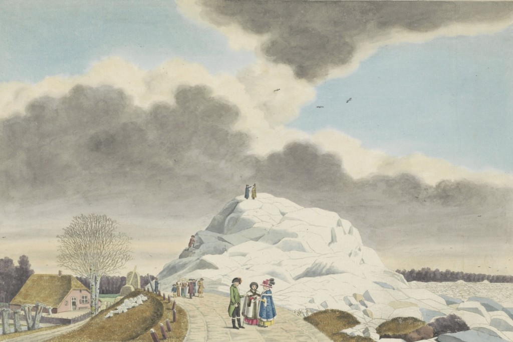 De afbeelding van het kruiend ijs is van de Nijmeegse kunstenaar Roeland van Eynden. Hij legde in 1789 de ‘ijsberg tegen de dijk te Ochten’ (Betuwe) vast. In tegenstelling tot in 1784 kwam het deze keer niet tot een dijkdoorbraak.