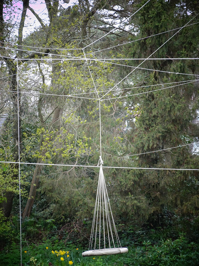 Ik snap het wel als mensen zeggen dat zo’n werk van Kuijl over verbinding gaat en dat de vergelijking met een digitaal netwerk wordt gemaakt. Op Groeneveld was het bijvoorbeeld bijzonder spannend omdat het kunstwerk zich deels in het altijd opengestelde deel van het park bevond en, op behoorlijke afstand daarvan, deels in het ‘kantoortijden’ deel. Je had dus werkelijk geen idee met wie je communiceerde via de schommelende touwconstructies.