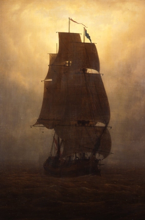 Gelukkig, de grootste schatten vind je op een rommelzolder. Voor ik het over Turner heb, eerst dit, en het had groots in de krant gemogen: er hangt een Caspar David Friedrich in Zwolle! Van deze beroemdste van de Duitse romantische schilders is zelden werk bij ons te zien. Maar nu is er dus ‘Zeilschip’, uit 1815. Waar Turner je in het leven smijt en waar het zwemmen of verzuipen is, praat Friedrich in symbolen. Het zeilschip staat voor de levensreis. Dit schilderij lijkt vooral de angst voor het onbestemde uit te drukken. Het schip vaart weg van het licht, stuurt dat kleine figuurtje zelf? -Of is hij overgeleverd aan de elementen?