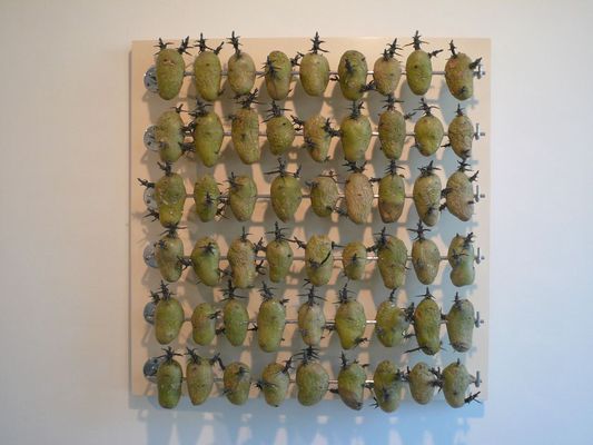 Op de lagere school deden we eens een experiment. Op verschillende plekken in het klaslokaal plaatsten we een pot met daarin grond en een aardappel. Daar kwamen planten uit, en een paar keer per week maten we die op. Hoe verder van het raam, hoe langer de ‘sliert’ die de plant produceerde om nog bij het licht te komen. Ik geloof zelfs dat we een plant hadden van twee meter. Het zijn dit soort ‘proeven’ die kunstenaar Sjoerd Buisman jarenlang deed. Niet alleen met licht maar ook met zwaartekracht (hij hing planten op hun kop). En hij snoerde planten, pompoenen bijvoorbeeld, in en zag hoe die daar op reageerden. Waar het telkens op neer komt is dat de kunstenaar de natuur als vormgever aan het werk zet. Heel sterk komt dat naar voren in een ‘sculptuur’ van aardappels die hij ooit maakte. Aan metalen pennen reeg hij de knollen die vervolgens wat uitliepen. Uiteindelijk droogde de boel in tot zwarte proppen. Als het niet zo wonderschoon was, zou je erom lachen. Buisman zelf zei: dit is kinetische- (bewegings) kunst, maar dan heel langzaam.
