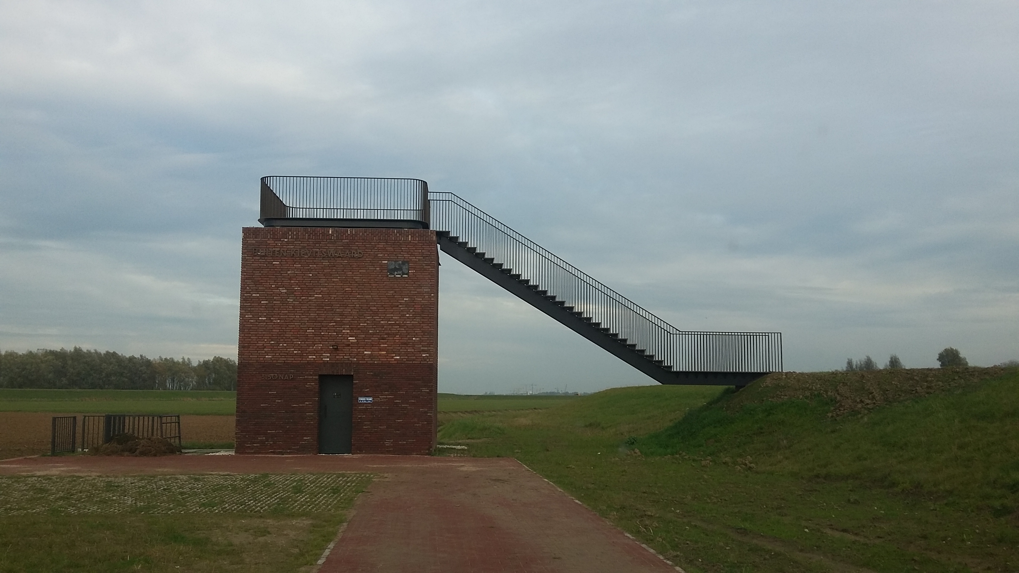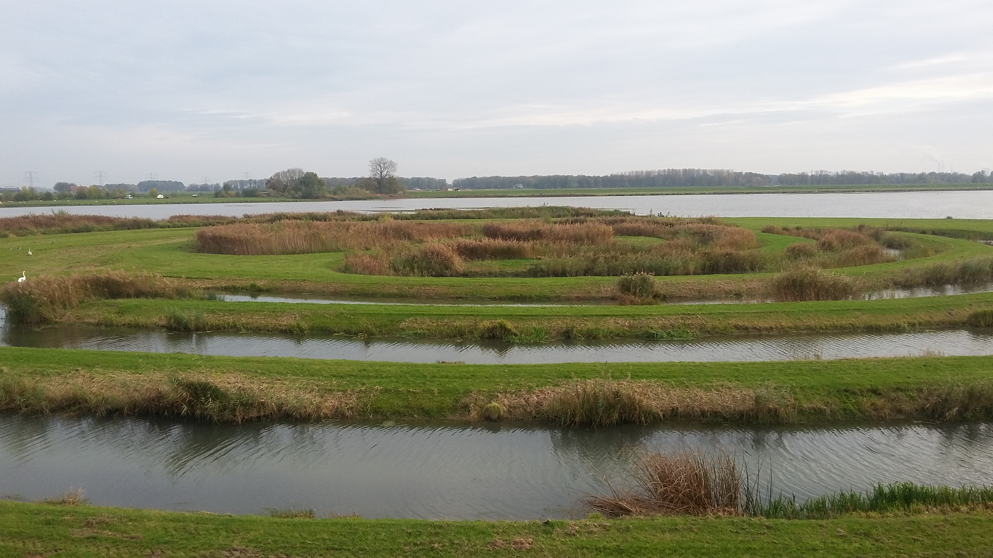 Het buurlandschap van Staatsbosbeheer, de Nieuwe Noordwaard, is een 4450 hectare groot gebied dat helemaal heringericht is om water uit de Nieuwe Merwede op te vangen. (Dan houden ze in Gorinchem ook droge voeten). Het ontwerp is van West 8 en IPV Delft en omvatte het verlagen van de dijk langs de Nieuwe Merwede met drie meter. Volledig gecontroleerd kan wanneer nodig, het water nu de polder instromen. Hierbij is goed gekeken naar hoe voor de inpoldering water al natuurlijk door kreken liep. Als de boel blank staat, kan het leven toch gewoon doorgaan: er kwamen 29 terpen voor huizen, 33 bruggen (in de onopvallende kleur van de klei hier), en 12 gemalen. Het nieuwe landschap staat op poten. Woeste natuur komt er op de meeste plekken niet -die belemmerd de doorstroming te veel. Maar, hoor ik van Staatsbosbeheerder Cors Aantjes, de bever is er gezien.