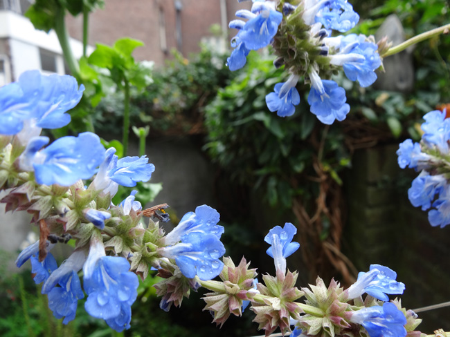 In de tuin: het najaar was blauw, met andijvie, dagbloem en salvia.