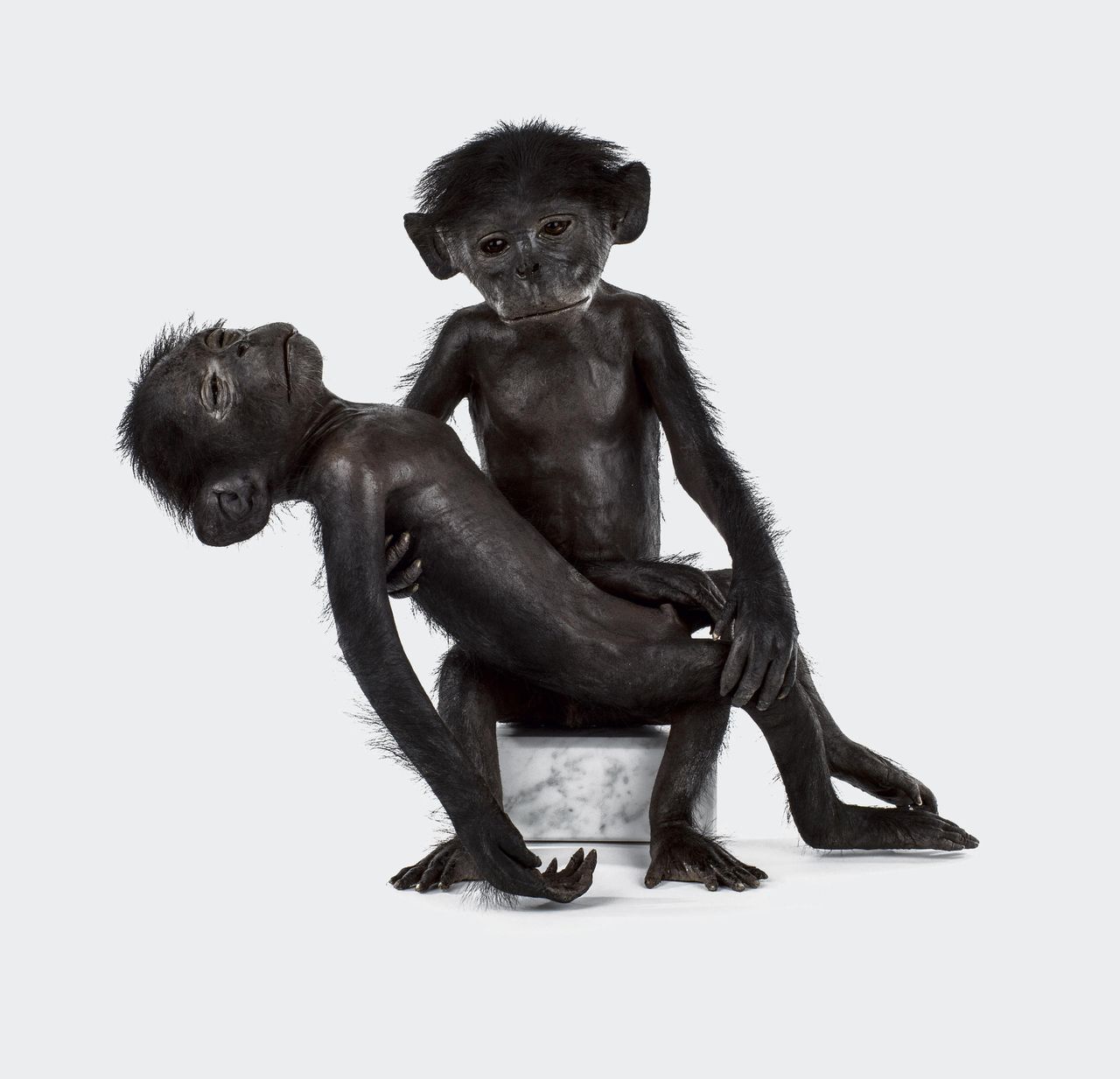 De twee jongens (beiden vijftig) voeren die ongemakkelijkheid op -en daarmee de kwaliteit van hun werk. Dode dieren die op levende mensen lijken zijn vermaak. Zoals dat in de negentiende eeuw het geval was. Maar wat als het dode dier op een dood mens lijkt? Daar word je heel stil van. De kunstenaars maakten van twee doodgeboren chimpansees een pietà (bewening van Christus door Maria). Het lijkt alsof Jezus alle leed van de wereld tot zich wilde nemen voor hij stierf. Maria heeft die ondefinieerbare mengeling van berusting en onpeilbaar verdriet in haar gezicht. Hier is niets blasfemisch aan.