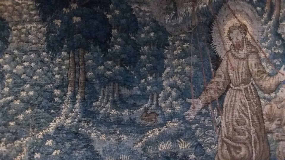 Maar volgens diezelfde Legenda vond het wonderlijke gebeuren, waarbij Franciscus een tweede Christus werd, plaats in de bossen op de berg La Verna. In de loop van de tijd, en zeker sinds de zestiende eeuw, zal het landschap een steeds belangrijkere rol krijgen in de verbeelding van de stigmatisatie. Sommige prenten lijken wel een zoekplaatje: zoveel rotsformaties en knoestige boompartijen dat je de figuren even ontgaan. Dat punt uit het leven van Franciscus vormt, net als bijvoorbeeld ‘de rust van de Heilige Familie tijdens de vlucht naar Egypte’, een belangrijk thema voor schilders om los te gaan met het landschap. Het weergeven van een bijbels of historisch tafereel, zelfs als dat relatief klein gebeurde, verhoogde de status van het schilderij of ander kunstwerk, terwijl de maker toch met die heerlijke natuur aan de gang kon. Van Os toont een kleed uit de vroege zeventiende eeuw, het bos is zo fijn daar wil je wel in vertoeven. Dat komt, legt Van Os uit, omdat de stigmatisatie een hernieuwing is van Christus’ kruisdood -en daarmee een herinnering dat de zondeval vergoed is. De natuur hier is als in het paradijs, dat in de hemel weer toegankelijk is voor de mens.