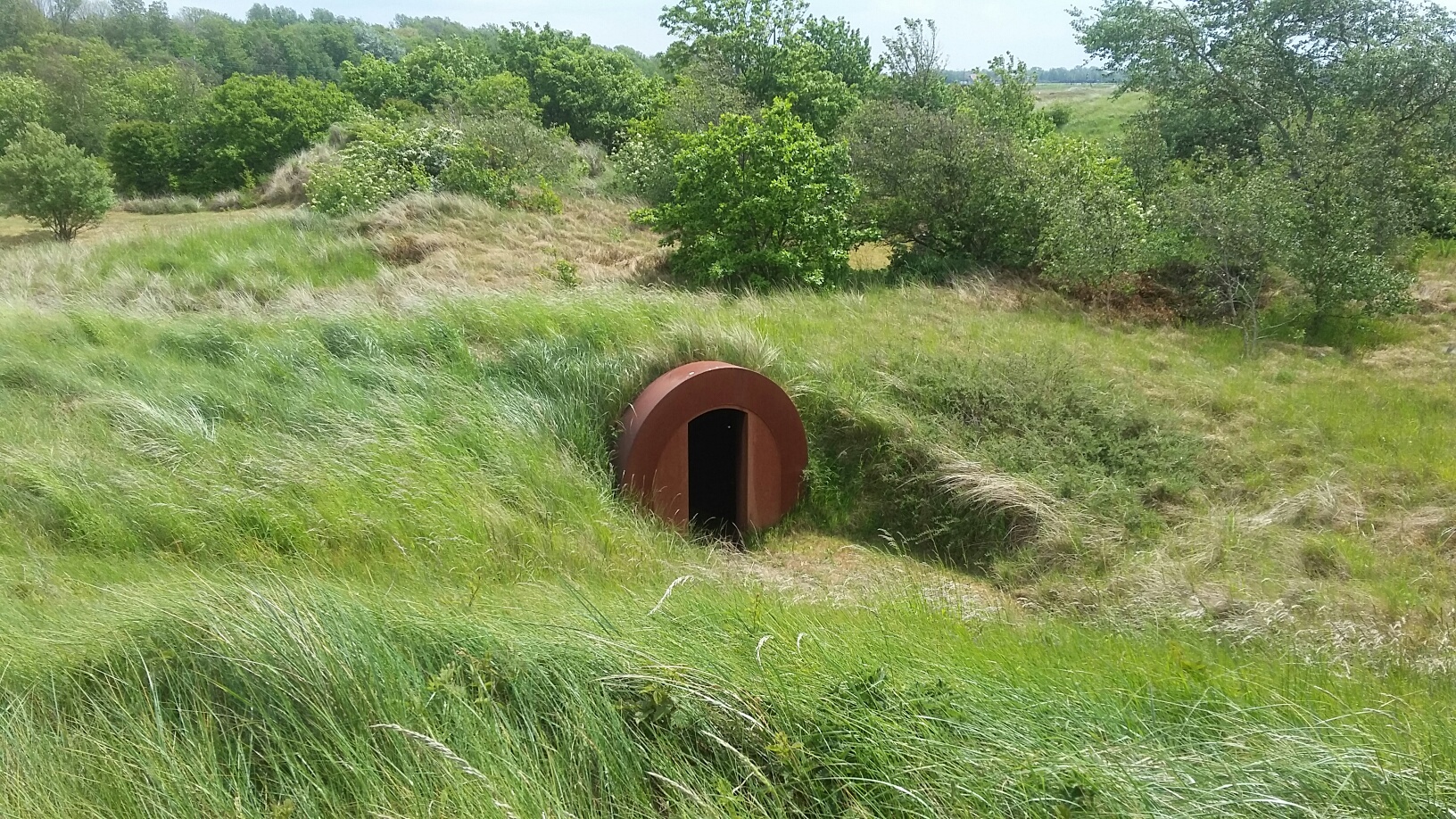 Het is niet vreemd dat ik hier aan de Engelse landschapsparken moet denken. Van de Wint is als een landschapsarchitect te werk gegaan, maar waar de grote namen uit de achttiende eeuw vaak vasthielden aan een verhaal dat verbeeld werd in de tuin en het park, is bij hem die narratief uitgebeend tot de essentie. Van de Wint vertelt niet over de held die door sinistere wouden moet en zo, hij laat je donker en licht ervaren. In De Nollen voert een duistere, onderaardse gang je naar een kleine ruimte waar geheimzinnig blauw licht naar binnen valt. Van daaruit gaat het via een andere gang (die niet alleen donker is maar ook koud en vochtig) naar boven. Uiteindelijk sta je in het heldere licht onder een koepel van riet. Het is de weg van de mysticus. In talloze kerken, vooral in Italië, is er een toegang tot een crypte. Het is de plaats waar de kerk in de grond geworteld is. Meestal kun je er een kleine rondgang maken en je verlaat dit binnenste weer via een trap. En dan: het hemels licht valt vanuit een koepel op het hoofdaltaar.