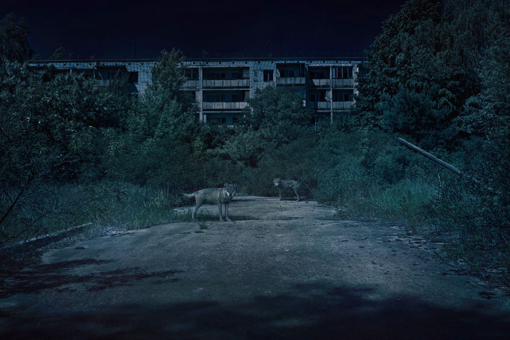 In de meeste gevallen is de getoonde invloed van de mens rampzalig. Zeker, er zijn de ongelofelijke natuuropnames uit Tsjernobyl van Adam Orzechowski. Toen na de kernramp een gebied van vele honderden vierkante kilometer werd afgesloten, was dit dé kans voor de natuur. Die hernam zich spectaculair. Duizenden bevers zorgden er in korte tijd voor dat het strakke landbouwgebied met zijn afwateringskanalen terugkeerde naar zijn ‘oerstaat’: moeras. De beverpopulatie wordt in toom gehouden door wolven, die er in precies dezelfde aantallen voorkomen als in de meest ideale schone gebieden. Ook andere dieren die zich bovenin de voedselketen bevinden (en waar je zou verwachten dat radio-actieve rommel zich het meest ophoopt) zoals valken en arenden gedijen. De beelden van Orzechowski doen aan Twelve Monkeys denken, de film waarin een groot deel van de mensheid aan een dodelijk virus ten onder gaat. De shots met de overlevende have uit de dierentuin, die vrij rondloopt in Philadelphia zijn van een surreële schoonheid. Bij Orzechowski rennen de wolven door de overwoekerde straten van Pripyat -ooit een stad met 50.000 inwoners. Dat maakt de foto’s van hem zo wrang: de natuur krijgt pas echt een kans nadat de mens het zichzelf onmogelijk heeft gemaakt. En bij al dat nieuwe leven, denk ik toch ook aan de 400.000 mensen die uit het gebied verdreven werden.