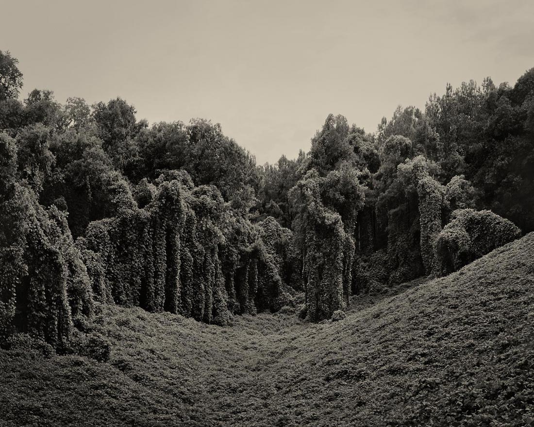 Verschillende kunstenaars leggen de invloed van exoten vast: al dan niet per ongeluk door de mens geïntroduceerde planten of dieren die in hun nieuwe omgeving ravages kunnen aanrichten, meestal omdat ze er geen vijanden treffen. Vanwege ons gesleep met natuur is de lijst nogal lang. Van de slangen op Guam tot de Japanse duizendknoop bij ons. Helene Schmitz toont prachtig donker werk. Zij legde vast wat kudzu vermag. Deze klimplant uit Japan is in de negentiende eeuw in het Zuiden van de Verenigde Staten geïntroduceerd als bodembedekker. Dat pakte anders uit: met een groeisnelheid van dertig centimeter per dag bedekte de plant alles en kreeg de bijnaam ’the plant that ate the South’. De foto’s doen aan sprookjes denken waarin men honderd jaar slaapt en de natuur haar gang gaat. Maar ondertussen verovert kudzu landbouwgebieden, electriciteitsmasten en bruggen.