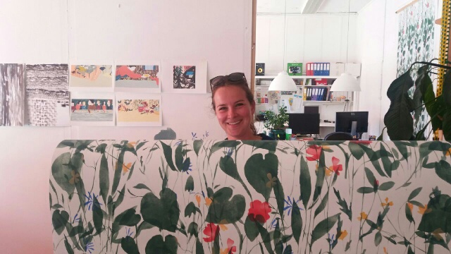 Het was een dag als uit de Camera Obscura –“zoo heet en zoo brandend…de zon scheen vinnig in de straten en glinsterde op de van droogte poeierig geworden keien.” Eindhoven haalde meer dan 35 graden. Het atelier van Dirks is te warm om in te werken. We voeren het gesprek in de tuin. Maar niet nadat de kunstenaar (“Ik zie mezelf als ontwerper”) rol na rol van haar plantendessins heeft laten zien. Zo’n woord als ‘dessin’, dat riekt een beetje naar ‘decoratieve kunsten’ en het komt zo uit het jargon van interieurbladenmakers. Dirks heeft er geen moeite mee. Ze wil iets maken dat mensen mooi vinden, waar ze blij van worden en dat ze in hun leven willen hebben. Als behang bijvoorbeeld. Dat is nou niet bepaald de houding die de kunstenaar bijgebracht wordt op een kunstacademie, waar het woord ‘autonoom’ nog steeds een aura van heiligheid heeft. Tekenend voor Dirks, die grafische vormgeving deed op Sint Lucas in Boxtel en kunstacademie Sint Joost in Breda, was dat ze niet zomaar paste in de onderwijsmal. Te vrij voor Sint Lucas, te weinig een eiland voor Sint Joost. We hebben het er kort over hoe opmerkelijk het is, dat Nederlandse academies nog steeds fantastische tekenaars afleveren, terwijl het toch niet zo is dat daar, naar het tekenambacht, veel aandacht in het onderwijs uitgaat –“Als je niet goed kon tekenen, dan was dat je stijl”, zegt Dirks. Voor haar afstudeerproject op de academie (2013), getiteld Plants make a garden, vroeg ze mensen naar hun favoriete tuinplant. En of ze die wilden tekenen. Uit het werk van anderen stelde Dirks een collage samen. Wat nou persoonlijk handschrift? Toch, dat was er toen ook al, haar manier van een vlak indelen, dingen (vooral planten) over elkaar heen laten vallen of juist los in de ruimte plaatsen. Een Dirks herken je. Ze heeft nooit ‘botanisch tekenen’ gehad. Wat ook niet erg is. Bij dat vak draait het om details en de exacte weergave daarvan. Dirks doet iets anders. Met de determineergids van Heukels in de hand kom je niet ver als je voor een werk van haar staat. En toch schept ze van die herkenbare plantenwirwarren. Soms doen ze denken aan wat je waarneemt als je in een berm door de knieën gaat en in een landschap in miniatuur terechtkomt. Takjes zijn als stammen, bloemen haast abstracte kleurvlekken, ‘grafische’ diagonalen verrassender dan je kunt verzinnen. Duizenden foto’s nam ze van hoe planten met elkaar composities vormen, gewoon naar hun aard. Maar die natekenen? Nee. Dirks heeft een archief in haar hoofd. Ook daar put ze niet letterlijk uit. Dat is natuurlijk haar geheim, hoe ze tot een patroon komt dat klopt. Maar het heeft iets te maken met kunnen spelen met beelden uit je herinnering. Toeval een rol gunnen –en op de achtergrond voortdurend wel dat bewustzijn van de beperking die je jezelf oplegt wanneer je een doorlopend patroon wil maken. En als dat lukt, ah dan is het mooi! Ik zou er wel een kamer mee vol willen hangen (niet één zo’n laf ‘Hollands’ wandje).