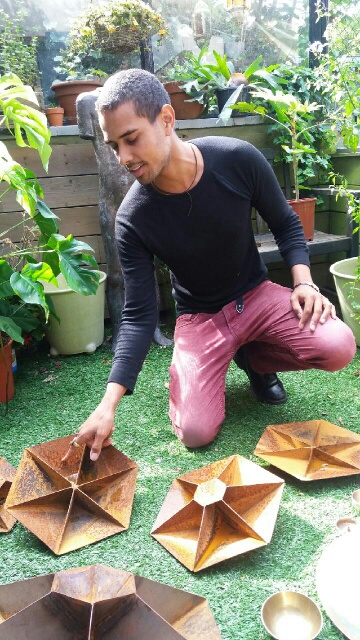 hij had het niet anders moeten doen. Dat zie ik bij zijn ‘zeshoeken’. Die zijn het product van wis- en natuurkundig inzicht én kunstenaarsintuïtie. De vorm is af. En hoe mooi ook, er zit niks voor de sier aan, het geheel komt voort uit een functie. Marengo de Swaaf vertelt hoe hij kantelpunten onderzocht. Zijn zeshoeken zijn als schalen met vakken, meestal zes, maar soms ook met een extra verhoogd centraal vak. De schaal ligt uiteraard altijd op één vak. De kunstenaar demonstreert: er gaat een emmer water leeg in het kunstwerk. En dan snap ik de tuimeling. Er is één punt waarop het vak tegenover dat welk contact maakt met de grond, zo gevuld is dat het kunstwerk kantelt. Een nieuwe balans -voor een moment: dynamisch evenwicht.