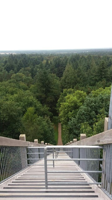 De trap ligt in een noord-zuid gerichte zichtlijn die Helene Kröller-Müller in 1930 markeerde met het kunstwerk Gewei van John Rädecker. Dat bestaat uit een grote steen waarin de kop van een edelhert is gehouwen. Tussen de geweistangen ontspringt een denkbeeldige as die zich voorzet in de trap. Een beetje een Katholiek (of een jager) moet dan aan het visioen van Sint Hubertus denken die een lichtend kruis tussen het gewei van een hert zag. Het werk van Giezen als een hemeltrap? Eerder het tegenovergestelde. De trap brengt je juist heel erg op aarde. Hoe hoger je komt, hoe meer de omliggende begroeiing zich sluit. Boven is niet een beeld uit het park meer te zien. Er is de uitgestrektheid van de Veluwe, met de bossen als een gigantische boerenkool, hier en daar is een lichtbruine vlek: de zandverstuivingen. En aan de horizon, net buiten de as, ligt een blokje. Dat is Radio Kootwijk.