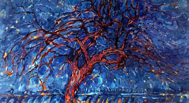 Er is veel geschreven over hoe Mondriaan zich verhield tot de natuur. Duidelijk is dat hij haar voor zijn abstracte doeken waar hij zo bekend mee werd, niet nodig had. Maar iedereen kan ook zien hoe zijn eerste abstracte schilderijen ontstonden door een natuurlijk gegeven zoals een boom ‘door te werken’. Het Kunstmuseum laat deze transformatie, die zo’n waterscheiding in de kunstgeschiedenis veroorzaakte, zien. Eerst is er Avond; De rode boom (1908-1910). Dat werk ontstond uit schetsen die Mondriaan maakte van een oude appelboom in de tuin van Marie Tak van Poortvliet in Domburg. De rode boom toont iets anders dan wat de kunstenaar waarnam (al bestaat er zeker zoiets als een onwaarschijnlijk rode gloed bij een zonsondergang aan zee), het gaat hier om wat een criticus ‘het