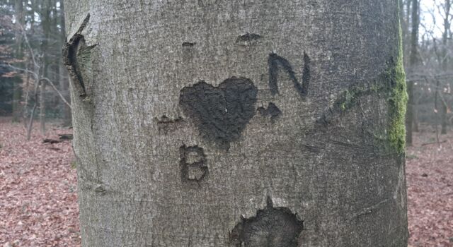 De laan is echt monumentaal, als het schip van een kerk. Er is wel wat uitval van bomen, vooral veroorzaakt door schimmels. Maar het dode opgaand hout is geweldig voor de groene specht, de rosse vleermuis en de baardvleermuis. Jelka toont mij tientallen inkervingen in de bast van de beuken. We zien harten, initialen, ‘I Love’. De liefdeshistorie van het dorp is hier opgeschreven. Maar die is niet zomaar te ontcijferen. We lezen ‘Sam en Piet’. Een afkorting voor Samantha? Voor Pieternel? Of toch gewoon Sam en Piet, waarbij m/v er niet toe doet. De Liefde is tenslotte voor iedereen.