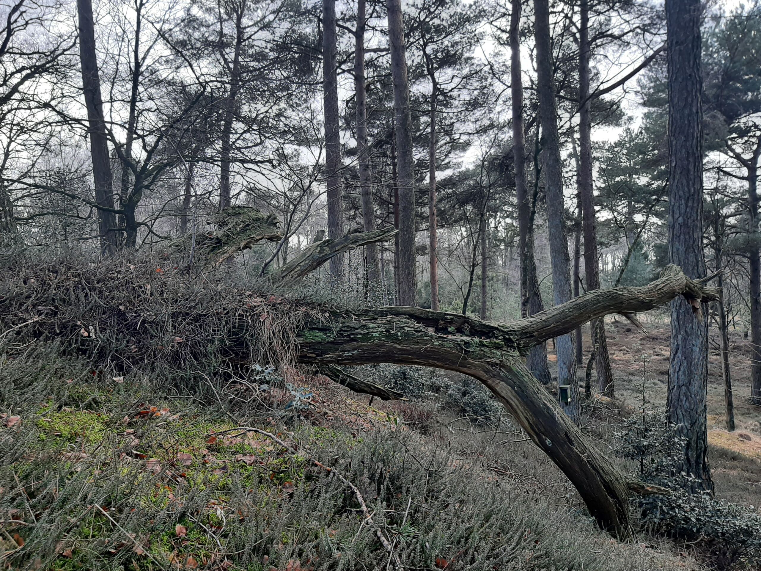 De eiken zijn inmiddels verdwenen, Oostenrijkse dennen staan er wel nog. ’t Haantje is al lang geleden gestorven. Albert heeft hem nog gekend als ‘dood opgaand hout’ maar nu ligt hij al decennia tussen de kraaiheide. Hoe mooi en fotogeniek hij is! Zijn grillige vorm met hier en daar korstmossen; vanuit elke hoek is er een verrassing. Sommige delen liggen op de vochtige grond en zijn al verder in ontbinding dan hoog uitstekende stukken. Wanneer het zonlicht, gefilterd door de boomkruinen, op dit magistrale versterven valt is er bosmagie.