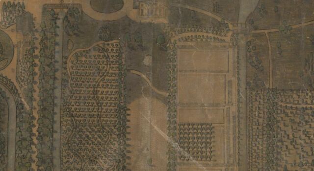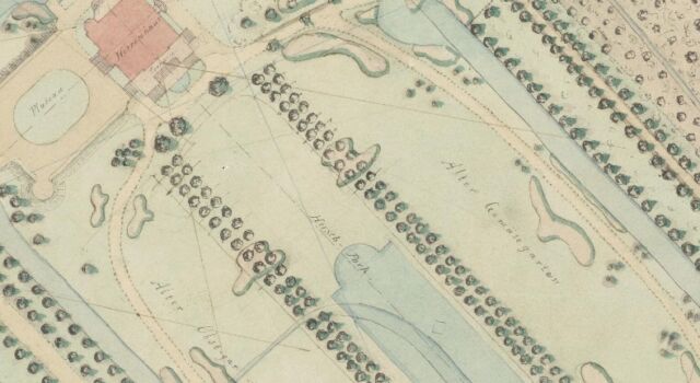 De rode beuk staat in het stuk dat de hertenbaan heet: een op het oog kaarsrecht stuk dat geflankeerd wordt door dubbele lindenlanen. Aan weerszijden van die lanen liggen ook rechte stukken. Die driedeling in blokken dateert al uit de zeventiende eeuw en is door alle smaakveranderingen heen behouden gebleven. De lanen zijn in de achttiende eeuw ingeplant, het stuk dat zij omgeven is sindsdien nogal van uiterlijk veranderd. Joost: ‘Het is goed om te beseffen dat dit deel aan een zijkant van het huis ligt. De hoofdingang bevindt zich om de hoek. Op de kaart uit 1812 zien we dat het blok waarin later de Borskiboom werd geplant in gebruik was als nutsdeel. Er werden aardappelen geteeld. In de belendende delen was sprake van boomgaarden en een moestuin. Maar wat opvalt is dat in het aardappelveld, precies op het midden van het huis uitgelijnd, een boom staat. Dat zegt verder niets, maar is opmerkelijk omdat het vlakbij de plek is waar de Borskiboom staat.’
