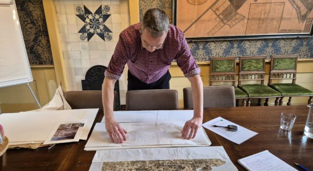 Voor we het over bomen hebben is er eerst nog een verrassing. Dat ben ik inmiddels gewend: bomenmensen hebben altijd nóg een boom die bijzonder is en ‘landschappers’ hebben voortdurend méér context bij de plek waar ik ben. Dat is rijkdom, en mezelf beperken laat ik even varen. Joost toont alle snippers en stroken van behangselschilderingen die bij de recente opknapbeurt van de kamer tevoorschijn kwamen. Met het onderzoeksrapport van de specialiste historische interieurs erbij. De vondsten zetten de toon voor het verhaal van Joost, waarin het gaat over steeds nieuwe puzzelstukjes van het verhaal van Elswout, die toch nog niet allemaal in elkaar passen. Maar het gaat ook over het besef van vergankelijkheid, of op z’n minst veranderlijkheid wanneer je een buitenplaats beheert. Verval, slijtage, (en op Elswout helaas ook vernieling); alles vergt voortdurend aandacht. En dat geldt niet alleen voor de gebouwde monumenten, ook een park wordt al snel iets anders wanneer je niets zou doen. Het glorieuze plaatje behouden is eenvoudigweg heel veel werk. En soms verlies je daarbij toch iets.