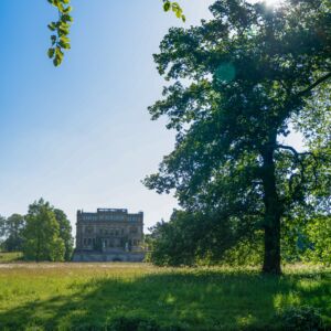Joost pakt er, digitaal, nog een kaart bij. Deze is uit 1883 en is gemaakt door de landschapsarchitect Eduard Petzold. Het interessante aan dit document is dat het uit twee lagen bestaat: in onderbroken lijnen is de oude situatie uit 1857 ingetekend (naar een inmiddels verdwenen kaart) en daaroverheen bracht Petzold zijn ontwerp aan. Het oog gaat natuurlijk onmiddellijk naar de plek tussen de lindenlanen. Daar staat nu de ‘Hirsch-Kamp’ (hertenbaan) ingetekend en er ligt een slingerende waterpartij (‘Serpentijn’) doorheen. Dat is dezelfde fraaie meander die we vandaag de dag nog kennen, en de Borskiboom staat aan zijn oever. En dan is er die schok: op de kaart staat wel een boom, maar die is precies in de middenas vanuit het huis gesitueerd, en niet heel ‘landschappelijk’ net daarbuiten zoals de geboorteboom. (Het is wat lastig te zien maar op de kaart duidt het vage cirkeltje naast het rechthoekig vakje in de hertenbaan een boom aan). Dan duizelt het me even van alle vragen. Natuurlijk kan het zijn dat de kaart ‘liegt’, maar heel aannemelijk is dat niet. En dat zou betekenen dat de stam die er nu staat niet het restant is van de geboorteboom van Willem Borski III. Dit exemplaar is op z’n vroegst na Petzolds kaart geplant. Op ansichtkaarten uit het begin van de twintigste eeuw staat hij er al behoorlijk uitgegroeid bij, maar verder is het een raadsel wie hem plantte, hoe oud hij is en wie het verhaal de wereld in hielp dat het een geboorteboom uit 1834 is.