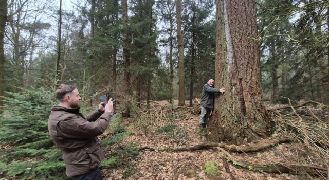 Bosbeheer is een voortdurend leerproces. Steeds weer blijkt in de praktijk dat vastgeroeste ideeën niet kloppen, of dat het toch net anders zit. Zo hoorde je vroeger wel dat de douglas een dominante soort is ‘die de hele Veluwe zou overnemen’. ‘Maar hier kun je zien dat ’t een watje is’, zegt Ronald. ‘Wat berk of lariks die over zijn top veegt en hij stopt zijn lengtegroei. Je moet douglas dus vrijzetten anders doet-ie ’t niet.’ En wat er gebeurt wanneer douglas al tachtig of negentig jaar ‘naar zijn aard’ kan uitgroeien kun je ook zien in de Emmerdennen. Een machtig exemplaar, zo’n veertig meter hoog, krijg ik niet eens goed op de foto.