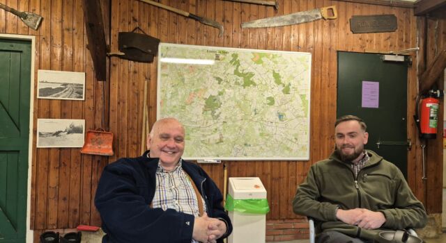 Bosadviseur Ronald Sinke (meer dan veertig jaar in dienst) ontvangt zijn opvolger Jaap Meeuwissen en mij in de werkschuur. Hier bekijken we oude kaarten en foto’s zodat we dat niet in de motregen hoeven te doen. Maar zoals meestal op dit soort plekken ben ik eerst even afgeleid: bijna altijd zijn er oude werktuigen uit de bosbouw en terreinvondsten om te bewonderen. Ronald laat de Folsche prunustrekker zien. Die is ontwikkeld door boswachter Gerrit (Ted voor bekenden) Folsche die in 2019 op 96-jarige leeftijd overleed. De trekker (in feite een metalen drietand aan een buis met twee stevige handvatten) werd gebruikt bij het verwijderen van jonge Amerikaanse vogelkers. En hoog aan de muur hangt een ‘meter’. Die is precies 100 centimeter en heeft aan beide uiteinden haken. Helaas: gebruik onbekend.