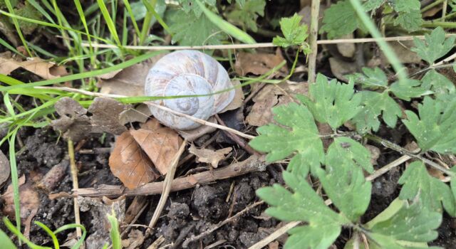 Het is zaak goed naar de grond te kijken. Er zijn enorm veel kikkertjes. En er kruipen slakken. En hier zijn dat vooral van die enorme wijngaardslakken. De wending van hun huisjes pleziert het oog. Normaal gesproken zou ik dan voor een blog uitzoeken hoe het ook alweer zat met de Fibonaccireeks en hoe je die in allerlei natuurlijke vormen terugziet. Dat doe ik nu niet, maar ik geniet wel van de beeldrijm die zich vanzelf voordoet als ik doorwandel. Van een gevlekte aronskelk heeft een dier het topje van de nog dichte kelk afgeknaagd. Ik kan zo in die normaal verborgen binnenruimte van de plant kijken. En ook daar: die wendingen! En even later staat er een mannetjesvaren, de stengels voor een deel nog opgerold. Het is heel makkelijk om daar iets symbolisch in te zien, over ontluiken en tot volle wasdom komen.
