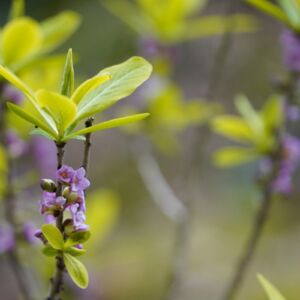 Deze struik bloeit met lichtpaarse bloempjes direct op het hout. Van februari tot april, dus dat hebben we net gemist. Later kleuren zijn bessen knalrood, maar nu zijn ze nog onopvallend groen. Het spannendste aan het rood peperboompje is eigenlijk het verhaal. Aan welke voorwaarden moet een terrein voldoen alvorens het peperboompje zich er vestigt? En wat is nodig voor zijn verjonging? Guido maakt deel uit van een heel team dat daar onderzoek naar doet. Het lijkt erop dat de struik alleen maar groeit op een hele specifieke overgang (gradiënt) van zuur naar kalkrijk. Daarbij moet hij voldoende licht hebben maar verdraagt hij geen al te sterke zoninstraling. Ook moet de bodem vochtig zijn en wat leem helpt daarbij.