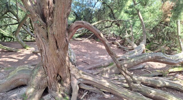 Een flink deel van de Zeegserduinen bestaat uit een zandverstuivingsgebied waaraan het terrein ook zijn naam ontleent. Kees bereidt mij niet voor en ineens staan we voor de enorme jeneverbes. Wel 450 tot 475 jaar oud, zo wordt geschat. Mooist van al: je kunt erin! Die ene struik heeft een soort berceau gevormd. De oudste delen hebben een schors die in de verte doet denken aan die van de sequioa, vezelig en bladderend. Zijtakken die neerwaarts buigen lijken wel gepolijst. Dat komt door het vele aanraken door mensen. Als monument kun je niet alles hebben: zeldzame mossen en paddenstoelen zullen zich hier veel minder vertonen dan bij exemplaren waar geen mensen komen.