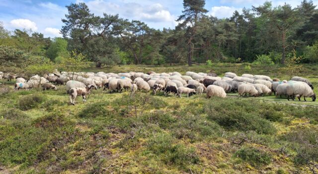 Kees vertelt hoe vanaf het moment dat hij hier in 2007 kwam, vrijwilligers betrokken zijn bij alles wat met de jeneverbes te maken heeft. Dat begon met een inventarisatie: 30 stuks, waarvan 5 vrouwelijk. Toen al werd duidelijk dat opslag van vooral Amerikaanse vogelkers verwijderd moet worden, wil de jeneverbes overleven. Ook dat gebeurde door vrijwilligers en wel handmatig. (Met machines zou je het hele terrein stuk rijden). Ze houden het sindsdien bij en krijgen daarbij wel hulp van de schapen. Dat is geluk hebben! We horen het rinkelen van schapenbellen. Herderin Julie is er met de kudde. Zij vertelt hoe de dieren zich ’s ochtends te goed deden aan het jonge groen van berk, braam, Amerikaanse vogelkers en hulst. Nu storten ze zich op het gras.
