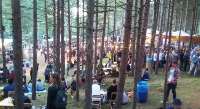 Het kan ook anders. Zo was ik jaren geleden op Into the Great Wide Open op Vlieland. En daar was een locatie, midden in een grove dennenbos, daar leek het omgekeerde aan de hand. Alles en iedereen, publiek, deejays, bands en foodtrucks stond tussen de bomen en die bepaalden wel degelijk de sfeer. Alleen al dat je op een zacht verend naaldenpakket loopt! Dat waar je ook kijkt overal boomstammen zijn, met boven je een kruinendak. Het bos was daar meer dan decor, het deed mee in het geheel.
