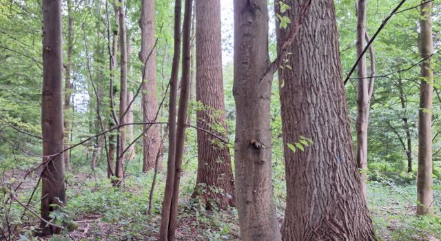 Wat is de nalatenschap van Vis? Met andere woorden wat is het huidige bosbeeld? Het cliché van Flevoland -populieren in rechte rijen -is nog steeds goed herkenbaar. En ook de onderbeplanting is op rij. Kijk maar op de foto naar de afwisseling ruwe bast (populier) en gladde bast (beuk). Maar overal is sprake van spontane opslag die het strakke van de plantschema’s verdoezelt. We zien inlandse vogelkers, dauwbraam, es, meidoorn, hazelaar, beuk en aan de randen, waar meer licht valt, zelfs eik.