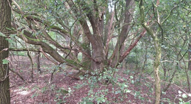 O ja, en er is natuurlijk altijd nóg een boom die ook gezien moet worden. Vlakbij de aangemelde eik staat een exemplaar, wellicht tweestammig uitgegroeid na het afzetten, of werkelijk bestaande uit twee bomen, dat is niet duidelijk, dat onze aandacht waard is. ‘Kijk nou, hoe mooi die stammen weer bij elkaar komen!’
